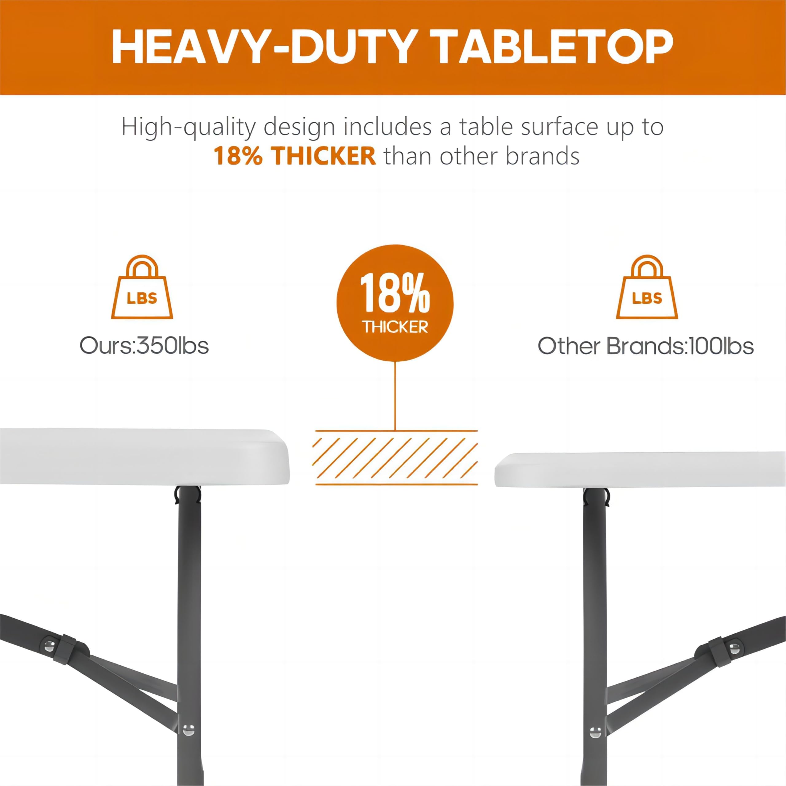 - THICKER TABLETOP & STRONG STEEL LEGS: Unlike many thin, flimsy tables, this upgraded folding table features an 18% thicker tabletop for enhanced durability, impact resistance and long-lasting performance. Thickened steel legs, triangle support bars and reinforced joints provide excellent stability, helping reduce wobbling and deformation so the table remains firm even under frequent or heavy-duty use.