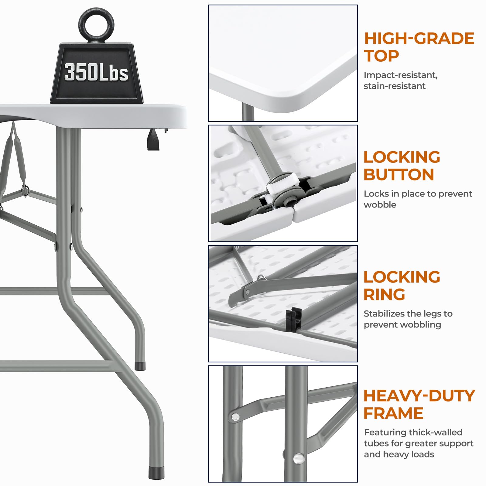 - HEAVY DUTY & STABLE STRUCTURE: This 6FT folding table is designed for strength, stability and long-term reliability. Built with a reinforced steel frame and thick HDPE tabletop, it supports up to 350 lbs of evenly distributed weight without bending or wobbling, giving you a solid, dependable surface for parties, meals, camping, events, family gatherings and everyday household use.