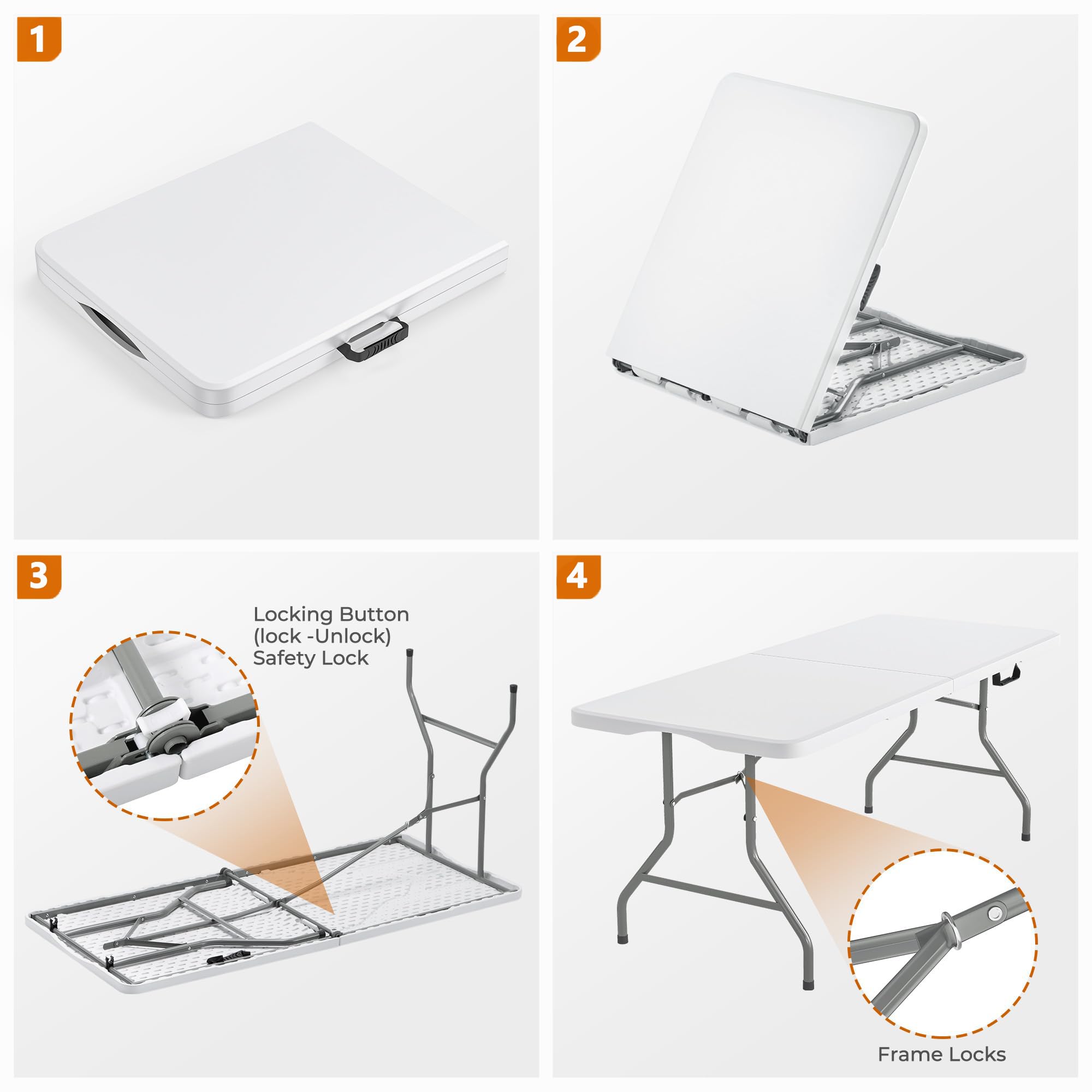 - SECURE LOCKING SYSTEM - NO ACCIDENTAL COOAPSE: Safety and stability are key when choosing a folding table. That’s why this table is equipped with a secure central locking button and additional leg locking rings to keep the frame firmly in place when opened. This dual locking system helps prevent accidental folding, reduces shaking, and offers stability for kids, families, events, food serving and busy gatherings.