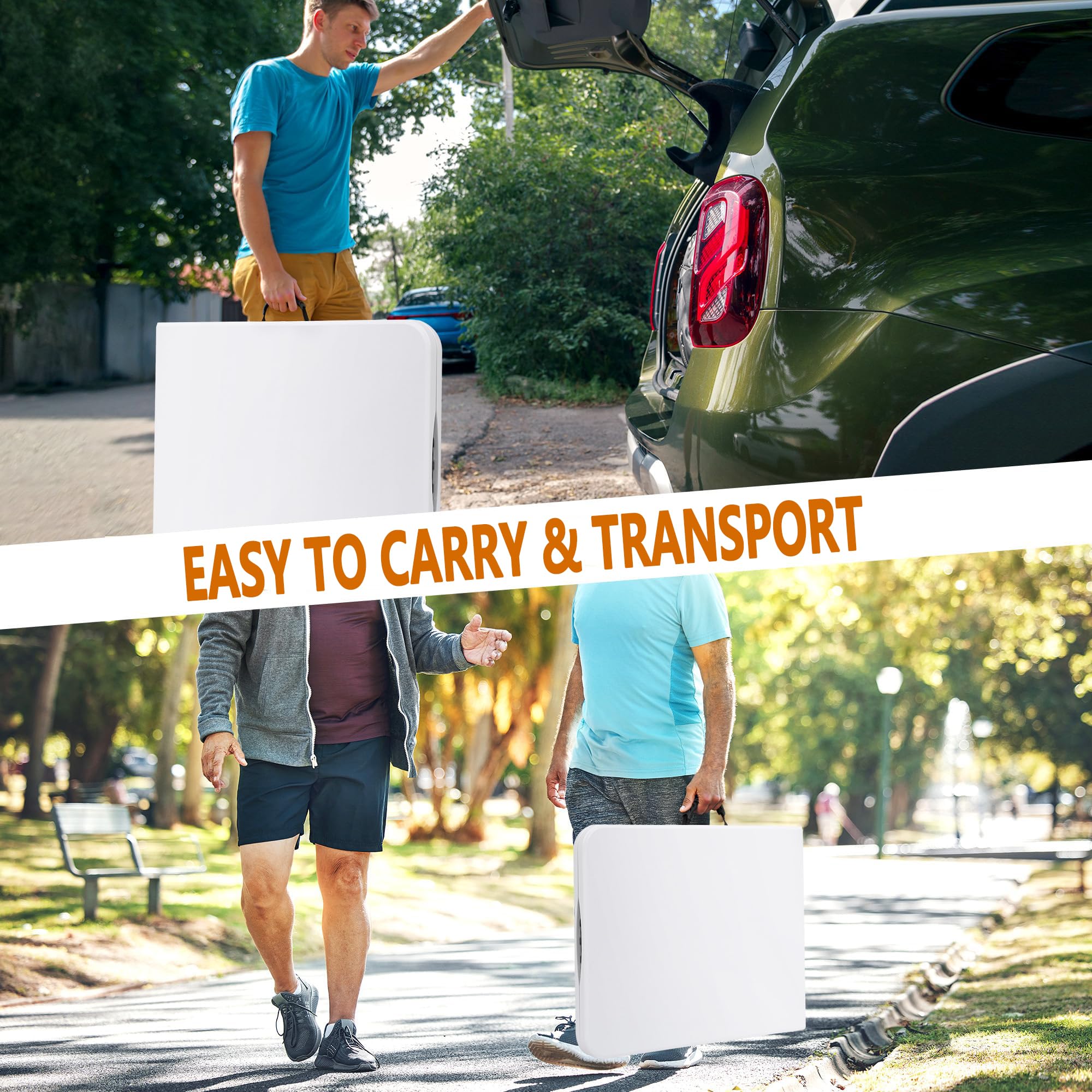 - FOLD IN HALF & EASY TO CARRY: Designed for convenience, this 6ft table folds in half within seconds into a compact suitcase shape measuring only 36 inches when folded. The built-in carry handle and flat foldable profile make it easy to transport, store and move from place to place. Perfect for closets, under-bed storage, garages, offices, RV trips, camping and keeping in the car trunk for anytime use.